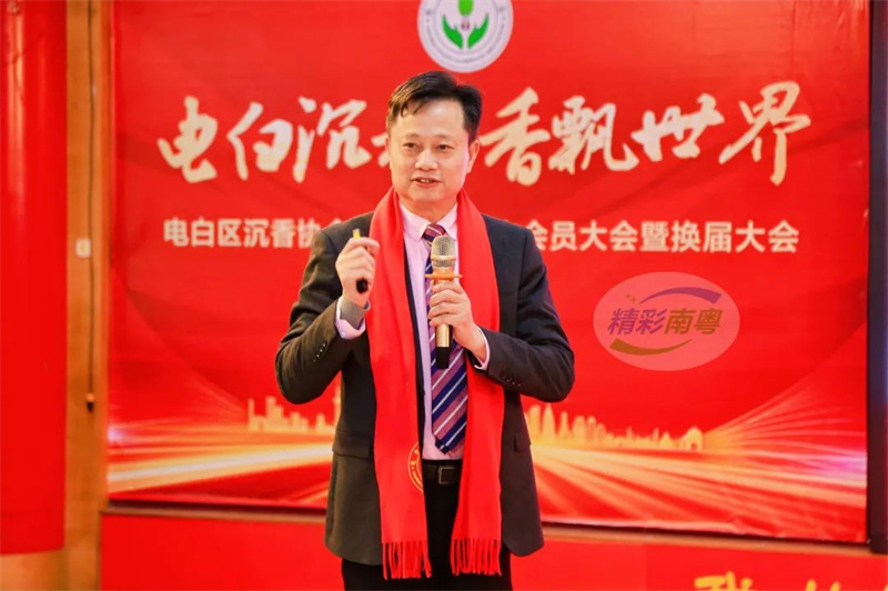 汪科元在当选为新一届会长后发表了热情洋溢的讲话。他表示,此次当选不仅是一份荣誉,更是一份沉甸甸的责任。他强调,本届协会的使命是助力电白区政府建设“世界沉香之都”,推动电白沉香产业向高质量发展进发,力争打造一个亿万级的沉香产业链集群,让电白沉香香飘四海。汪会长特别提到,电白沉香以其独特的地域特色,孕育出了高品质的伽楠香,未来要进一步加强伽楠香在中医药领域的应用和推广。