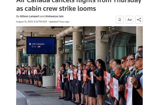 (《健康生活报道》综合报道)加拿大航空公司(Air Canada)13日宣布,将从本周四(8月14日)开始分阶段取消航班,并计划在周六(8月16日)凌晨前全面停飞旗下包括Air Canada Rouge在内的所有航班(路透社 8月13日)。此举是为了应对即将到来的大规模客舱乘务员罢工,避免旅客在行程中途遇到突发中断(美联社 8月13日)。