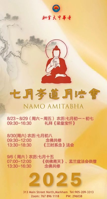 (《健康生活报道》据万锦市中华寺消息)为弘扬佛教孝亲报恩精神,中华寺自农历七月初一起,举办为期多日的孝道月系列法会,包括《梁皇宝忏》、《三时系念》、《供佛斋天》及盂兰盆法会暨供僧。寺方表示,法会功德将回向世界和平、风调雨顺、灾障消除、众生安康。