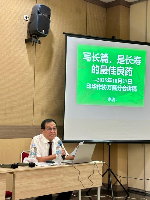 万隆的讲稿长达11页,讲题是《写长篇,是长寿的最佳良药》。万隆讲座主要是印华作协万隆分会会长洪念娟促成。她问我这次我们来不来万隆?参加研讨会?我很好奇,反问,什么研讨会?她说,你来了就有。原来,她是幽默婉转地邀约我去万隆举行一次讲座,题目由我决定。熬不过她的真心和热情,我就找了不少参考资料,写成了长达9页的讲稿《写长篇,是长寿的最佳良药》。主要是来听的文友年纪都大了,有不少都进入了长者阶段,也由于印华文坛其他文体都不少了,最缺的就是长篇小说。