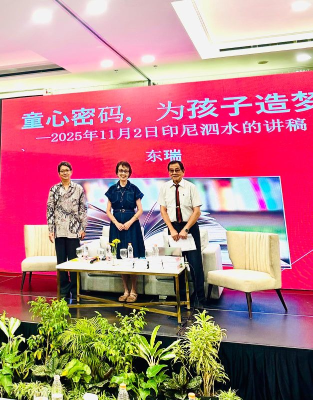 我们在雅加达逗留了5夜,11月1日飞泗水,2日在东盛礼顿酒店举办东瑞演讲会暨叶竹新书发布会。我的讲题《童心密码,为孩子造梦》,讲稿写了9页,叶竹是东区文友协会主席,发布两本新书是《叶竹旧诗词新写》及儿童诗集《小成双语儿童诗》。21楼的会场非常好,座椅的设计都是参照国际标准,来听的据报道非常多,有印尼哈夷郑和基金会创办人哈夷柳民源,千岛日报社社长陈平和、秘书邵秀明,印尼东文区友协会理事和会员,泗水国立大学孔子学院学生,东爪哇华文教育统筹机构主席苏先源,以及泗水新中三语学校、泗水小太阳三语学校、泗水开明三语学校、泗水中中华语学习中心、印华中文补习学校、东爪哇书画协会 、泗水永春汉语中心、泗水诚信汉语学习中心的领导、老师和学生约100余人出席,最感动的是泗水国立大学孔子学院戴着头巾的伊斯兰女大学生约有十几二十人都在座。