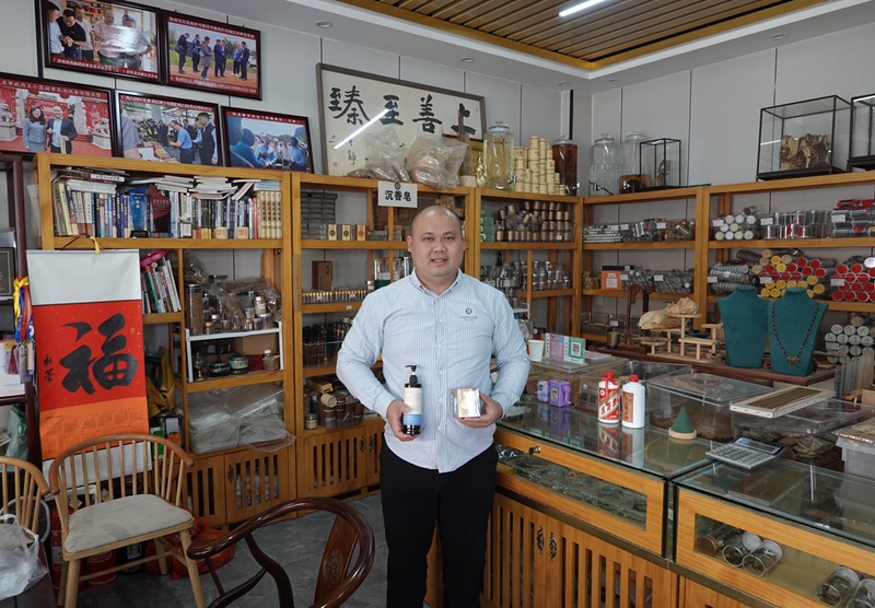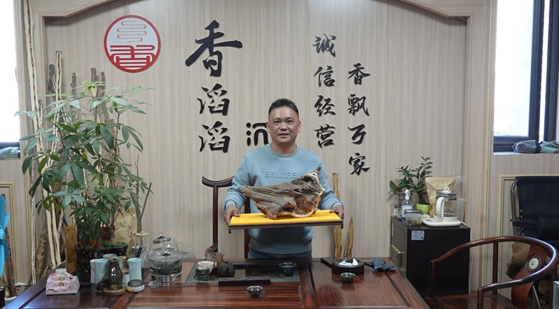 华南香盟董事长黄德丰,则以产业链布局者的身份出现。他介绍企业新厂面积约一千平方米,将用于晒香、晾香、砍料、烤香、手串制作与精油提炼,并规划展厅、接待室、粉碎车间、搅拌车间与包装区。他强调企业产品主要面向中东市场,并已按照当地标准进行规格细分与包装调整。他认为中东市场需求强劲、文化匹配度高,将成为沉香出口的重要区域。他的语气坚定,带着一种产业战略家的判断。