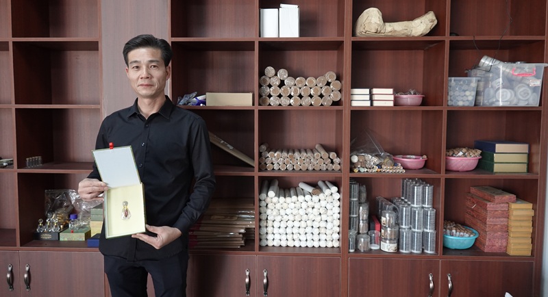 木骨香魂董事长黄利福,则代表“沉香的审美表达者”。他专注珠子、线香与文创方向,介绍奇楠线香与富森红土搭配壳子料的产品能调出偏甜气息,“闻了第一根就想闻第二根”。他强调线香艺术化呈现,包括车挂、挂牌、佛像卡等多样造型,展现沉香审美可能性,并表示对第二届展会充满期待。他代表沉香的文化属性与审美气质。