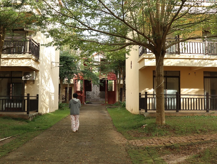 十里田海的住宿区采用黎族建筑风格,十八幢错落有致的小楼散落在椰林和翠竹之间。阳光洒落屋脊,屋舍与田野、荷塘交相辉映,构成一幅极具海南地域风情的田园画卷。