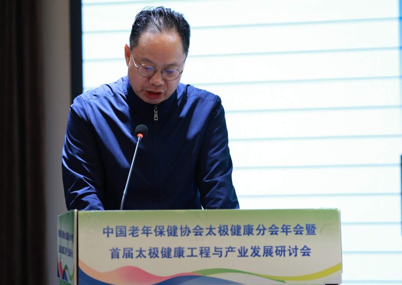 中智科学技术评价研究中心副理事长、副主任沈金华讲话。他代表李闽榕理事长,对中国老年保健协会太极健康分会年会暨产业研讨会的隆重召开表示热烈的祝贺。他强调太极健康工程科学化是必须、产业化是引擎、大众化是根本、国际化方向。