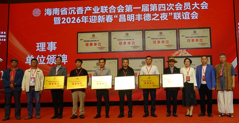 当晚举行的第一届第四次会员大会暨2026年迎新春“昌明丰德之夜”联谊会上,联合会为新增补的副会长、理事单位举行颁牌仪式,海南省民政厅向海南省沉香产业联合会颁发“5A级社会组织”证书。联谊会在歌声和音乐中展开,成为沉香产业同仁交流情谊、凝聚共识的重要平台。